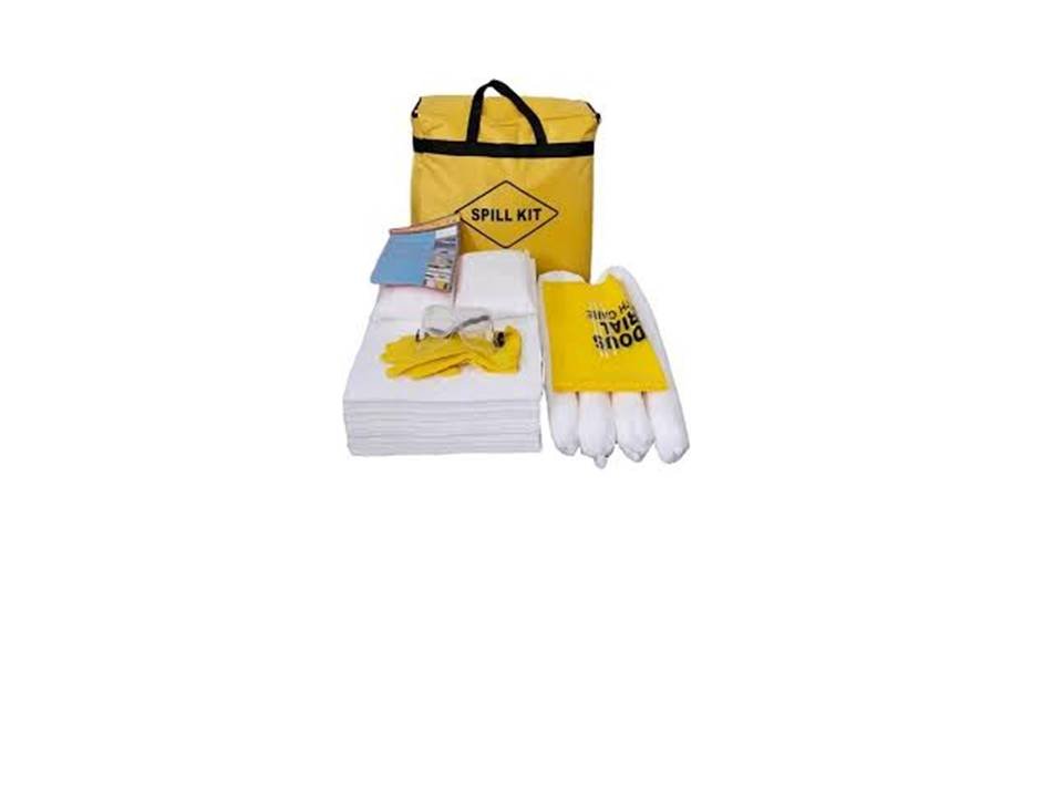 Portable spill kit for oil and chemical spills. Complies with OSHA/ANSI standards. Includes absorbents, gloves, and disposal bags.